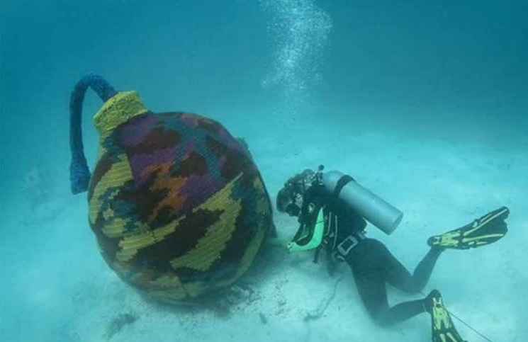 El director del espacio escultórico, Roberto Díaz Abraham, informó que, sin autorización, la artista Ágata Oleg, tejió un suéter para cubrir una o dos de las esculturas de la pieza llamada “Las Bombas en Nizuc”, ocasionando daños a la vida marina que recubre las esculturas.