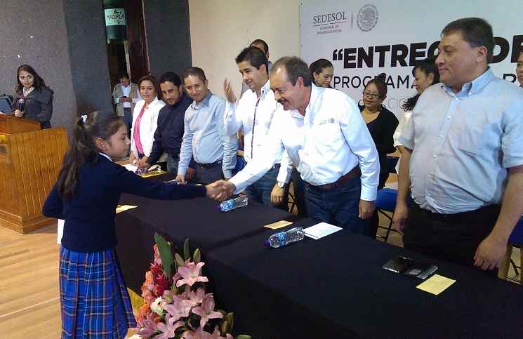 A nombre del Gobierno de la República que encabeza Enrique Peña Nieto, se hizo entrega de becas escolares a 282 niños y niñas que cursan primaria y secundaria mediante el programa 3×1 para migrantes de la Sedesol.