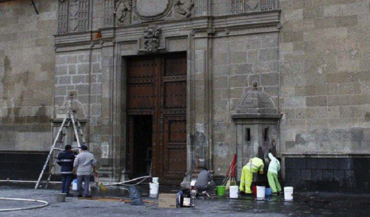 Elementos de carpintería, así como de limpieza del Gobierno del Distrito Federal trabajan desde primeras horas de la mañana para limpiar y restaurar los daños registrados ayer en el Palacio Nacional.