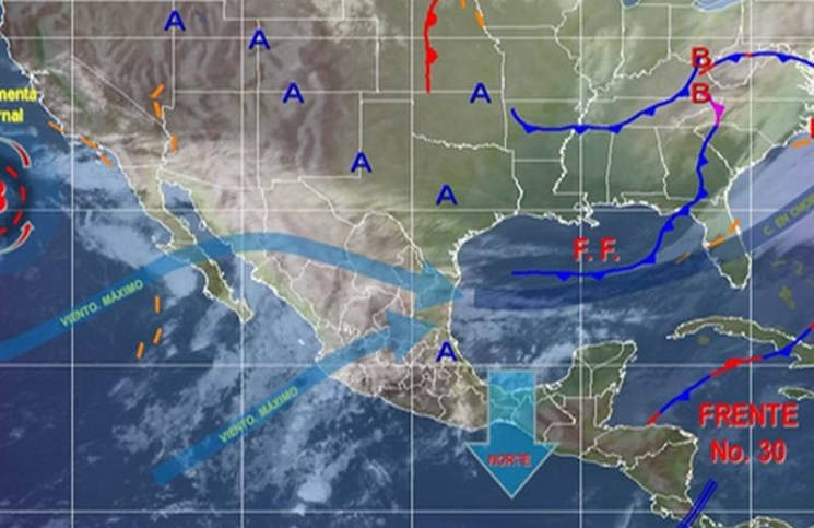 Por otra parte, el Meteorológico expuso que un canal de baja presión en niveles medios de la atmósfera, correspondiente a los remanentes de la cuarta tormenta invernal, provocará nublados con lluvias menores a 25 milímetros en la Península de Baja California.