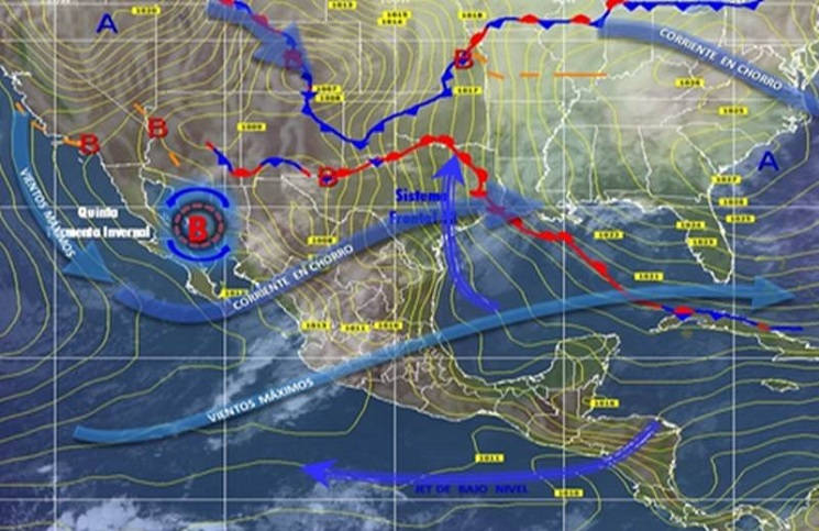 Mientras que el frente frío 33 se encontrará desde la región central de Veracruz hasta el norte del país, y su masa de aire frío reforzará los efectos de la quinta tormenta invernal sobre el norte de México.
