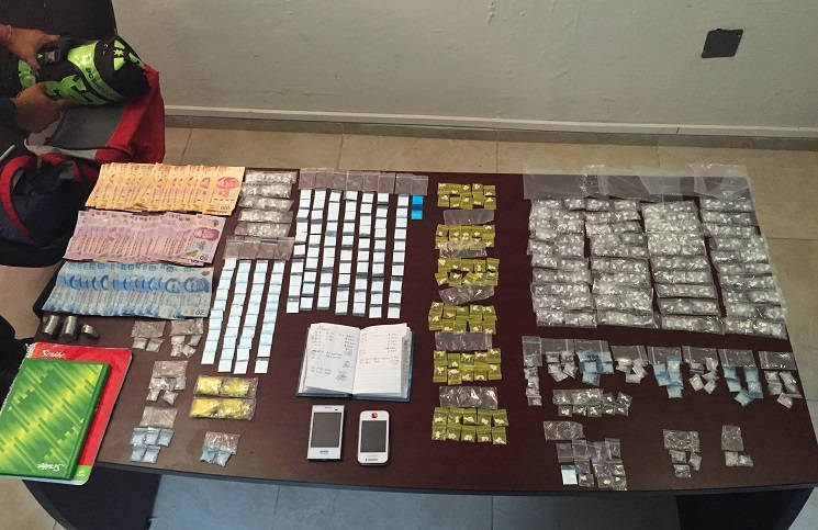 En el lugar fueron detenidos los indiciados en posesión de 169 gramos 960 miligramos de cocaína, distribuida en 656 envoltorios de plástico; 35 gramos 530 miligramos de metanfetamina, también conocida como “crystal, ice o hielo”, distribuida en 63 envoltorios de plástico, y 8 pastillas psicotrópicas de MDA y cafeína, listos para su venta y distribución, así como 5 mil 280 pesos, producto de la venta de las drogas, además de dos teléfonos celulares.