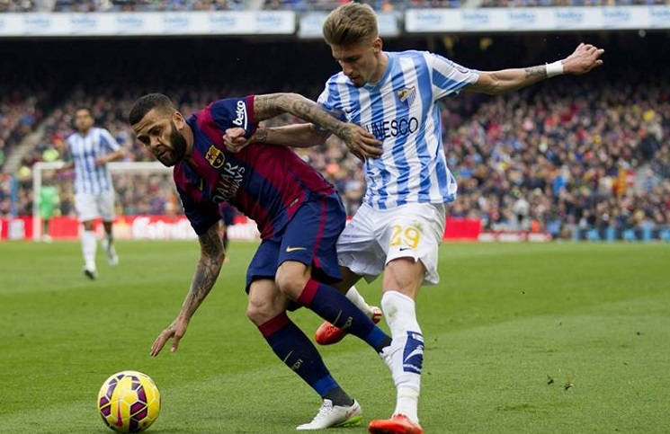 Con un claro dominio del balón los culés buscaban abrir espacios en el área rival, sin embargo, Málaga vio fortuna tras la contra al minuto 7, donde Dani Alves trató de asistir a su guardameta, pero el toque hacia atrás fue deficiente y Juanmi aprovechó para conducir el esférico hacia las redes blaugranas.