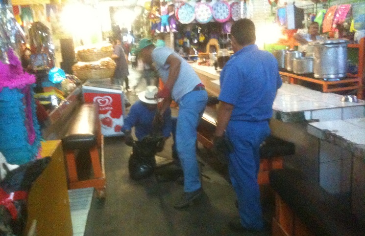 Las labores son realizadas por personal operativo y con la ayuda de un vactor se presta especial atención a las áreas de alimentos y flores de estos espacios comerciales, pues es donde en un momento dado se pudieran presentar taponamientos en la red de drenaje, dado el tipo de productos que se venden; sin embargo, también se desazolvan los pasillos de metálicos, zapatos, artesanías, ropa, entre otros.