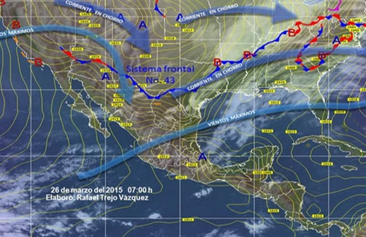 De la costa oriental de Estados Unidos hasta la Península de Yucatán se extenderá el sistema frontal número 43 y favorecerá probabilidad de lluvias puntuales intensas y generará torbellinos en Chiapas y Tabasco, alertó el Servicio Meteorológico Nacional (SMN) .