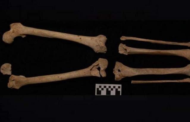 Uno de los esqueletos pertenece a un hombre de unos 45 años, sorprendentemente alto para su época (unos 180 centímetros), cuyo fémur y tibia muestran una fusión ósea completa a la altura de la articulación de la rodilla, así como un orificio en la misma, provocado por una herida penetrante que la atraviesa. Este individuo padecería una notable cojera.