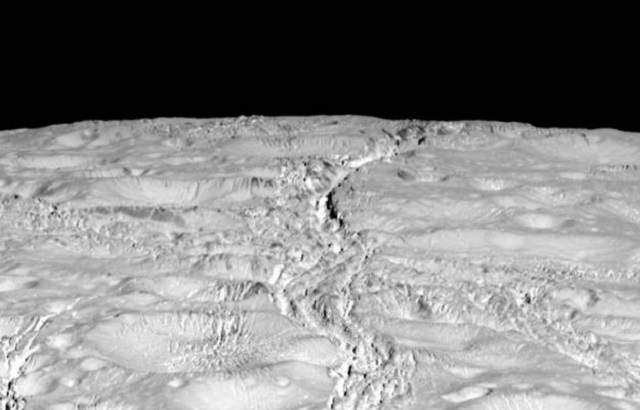 “Las regiones del norte están atravesados por una red de grietas delgada que atraviesan los cráteres”, indicó Paul Helfenstein, un miembro del equipo de imágenes de Cassini en la Universidad de Cornell, Ithaca, Nueva York. “Estas grietas finas son comunes en Encélado, y ahora vemos que se extienden a través de la región norte también”, comentó.