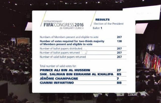 El suizo Gianni Infantino y el jeque Salman Bin Ibrahim al Jalifa se llevaron la mayoría de votos, 88 y 85, respectivamente; el príncipe jordano Ali Bin Al Hussein resultó con 27 votos.