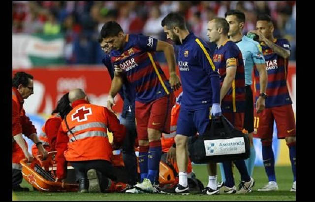 Suárez se retiró renqueante a los 56 minutos del partido contra el Sevilla en el estadio Vicente Calderón de Madrid. Celebró con sus compañeros tras la victoria 2-0 ante Sevilla en tiempo extra, pero caminaba con cuidado y evidenció algunas muecas de dolor.