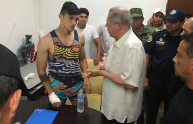 Pulido, quien vestía un short y camiseta de tirantes, pues al momento que fue privado de su libertad regresaba de una fiesta en una alberca a la capital del estado, presentaba escoriaciones en su pecho y una lesión en su mano derecha que fue atendida por los médicos.