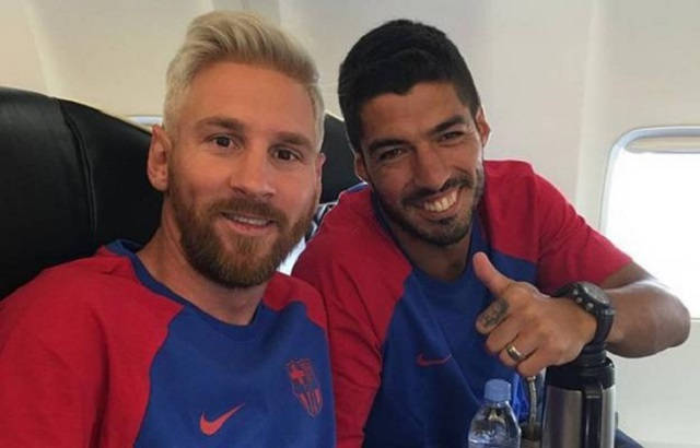 “Partiendo a Inglaterra. Siguiendo la pretemporada y mi amigo con nuevo look”, escribió el delantero uruguayo Luis Suárez en su cuenta de Twitter, en la que subió una foto con Messi en el avión.
