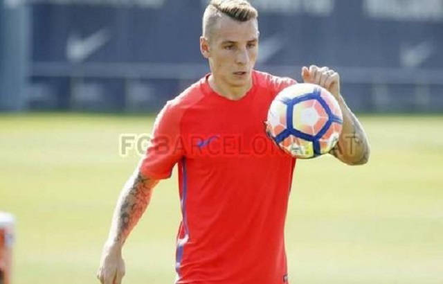 El lateral francés Lucas Digne, uno de los fichajes barcelonistas para el próximo curso, ha sido la sorpresa del entrenamiento de hoy, ya que se ha incorporado antes de hora al trabajo del equipo.