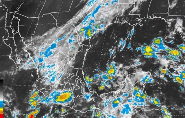 Para el Pacífico Sur se estima cielo medio nublado a nublado, 80 por ciento de probabilidad de intervalos de lluvias fuertes con tormentas puntuales intensas acompañadas de relámpagos y truenos en Oaxaca, Chiapas y Tabasco, y tormentas puntuales fuertes en Guerrero.