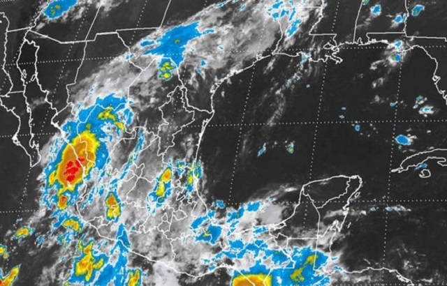 En el Golfo de México se espera ambiente nublado por la tarde, probabilidad de intervalos de lluvias muy fuertes con tormentas puntuales intensas de 80 por ciento en Veracruz, intervalos de lluvias fuertes con tormentas puntuales muy fuertes en Tabasco, e intervalos de lluvias con tormentas puntuales fuertes en Tamaulipas.