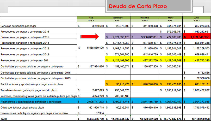 Sí el gasto de operación del gobierno estatal ha aumentado en el 6.27 ya señalado, la denominada “Deuda a Corto Plazo” se disparó en el mismo periodo, pues creció en un 56.6%, es decir 5 mil 577 millones de pesos. Así las cosas, la deuda de corto plazo “relativamente identificada” es de 13 mil, 158 millones, 230 mil, 928 pesos al 30 de junio del 2016.