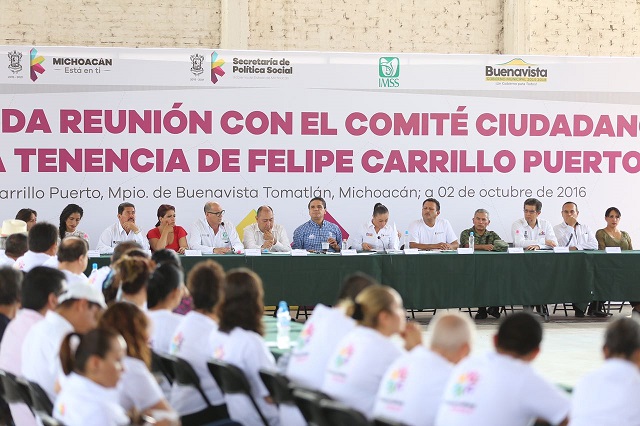 Este domingo el Gobernador de Michoacán, Silvano Aureoles Conejo, presidió la 2a Reunión con el Comité Ciudadano de la tenencia de Felipe Carrillo Puerto, municipio de Buenavista Tomatlán. Para dar seguimiento a las obras y acciones que realizarán para transformar a la comunidad y reconstruir el tejido social, este 2 de octubre el mandatario michoacano escuchó de los integrantes del Comité, los avances en materia de educación, salud, seguridad y cada uno de los rubros.