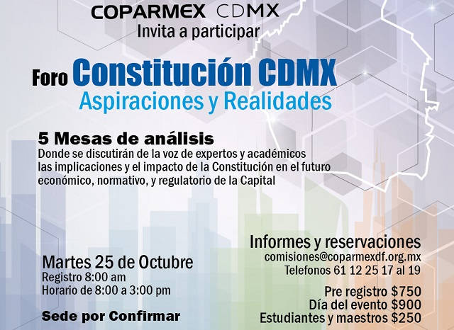 Con el objetivo de analizar y crear propuestas para el fortalecimiento del sector empresarial, en el marco de la conformación de la Constitución de la Ciudad de México, la Coparmex-CDMX llevará acabo el foro “Constitución CDMX. Aspiraciones y realidades” con la presencia de importantes actores políticos, económico- financieros, investigadores y expertos en el tema.