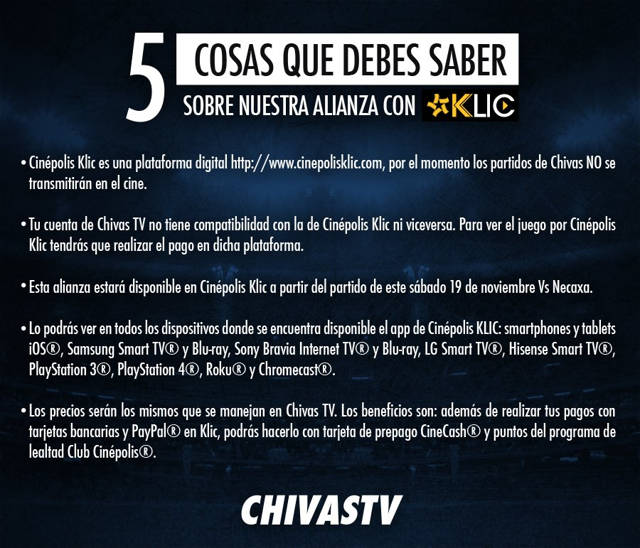 Chivas TV dio un paso más para acercarse a la afición rojiblanca, luego de anunciar su alianza con Cinépolis Klic, una plataforma digital que podrá transmitir los juegos del Rebaño Sagrado en vivo.