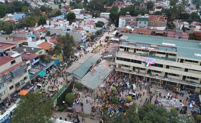 Elementos de la agrupación “Topos” junto con efectivos del Ejército Mexicano y ciudadanos voluntarios intentan rescatar a una niña de ocho años que está sepultada por una loza en el Colegio Rébsamen.