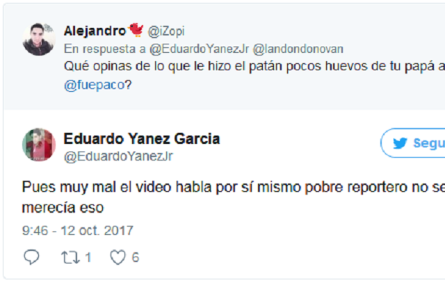 Posteriormente, Eduardo Yáñez Jr. fue cuestionado directamente por el usuario @iZopi: “Qué opinas de lo que le hizo el patán pocos huevos de tu papá a @fuepaco?”, a lo que el hijo del actor respondió: “Pues muy mal el video habla por sí mismo pobre reportero no se merecía eso”.