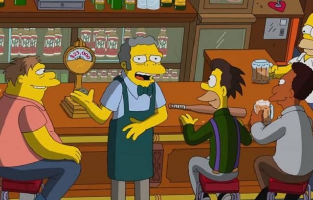 Mo obliga al borrachín Barney a finalmente pagar su cuenta, de unos sustanciosos 25 mil dólares, que promete donar a UNICEF, One America Appeal y Save the Children.