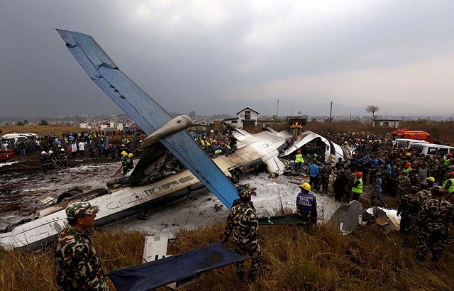 El avión, un Bombardier Dash 8 con matrícula S2-AGU que llegó a Katmandú procedente de Dacca, se estrelló alrededor de las 14.20, hora local 08.35 GMT), durante el aterrizaje en el aeropuerto internacional Tribhuvan, incendiándose y generando una gran columna de fuego y humo.