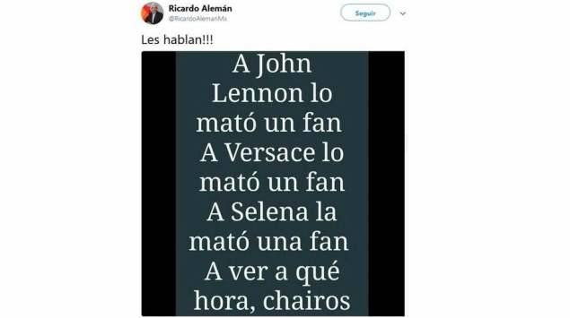 “‘ A John Lennon lo mató un fan. A Versace lo mató un fan. A Selena la mató una fan. A ver a qué hora, chairos’ . ¡Les hablan!”, decía el mensaje compartido por quien ganó el Premio Nacional de Periodismo en 2005.