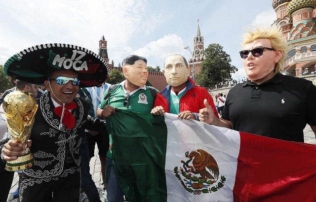 Los aficionados mexicanos ya se hacen notar en las calles de Moscú, ya sea con trajes típicos, banderas, réplicas de la Copa del Mundo, cánticos y por qué no, con máscaras de Donald Trump, Vladimir Putin y Kim Jong-un, mandatarios de Estados Unidos, Rusia y Corea del Norte, respectivamente.
