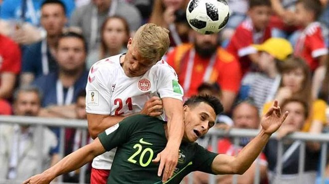 Apenas volvió a aparecer el talentoso jugador danés, salvo en acciones a balón parado, bien vigilado por Mooy y Jedinak en el centro del campo australiano. La selección aussie, sin nada que perder tras la derrota en la jornada inaugural, dio un paso adelante en busca de un gol que le diera oxígeno para la tercera jornada. Fue Mathew Leckie el futbolista australiano que más peligro llevaba con acometidas desde la derecha y por el centro. El centrocampista del Hertha de Berlín provocó el penalti de Poulsen que dio origen al empate a uno al transformar Jedinak la pena máxima en el minuto 39.