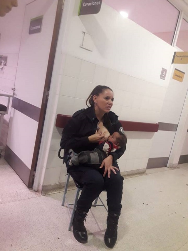 Su nombre es Celeste Ayala, agente de la Bonaerense en Buenos Aires (Argentina), quien al notar que el bebé lloraba, pidió permiso para amamantarlo. Ella supuso que el bebé tenía hambre y, tras obtener el permiso, dio pecho al bebé y éste dejó de llorar.