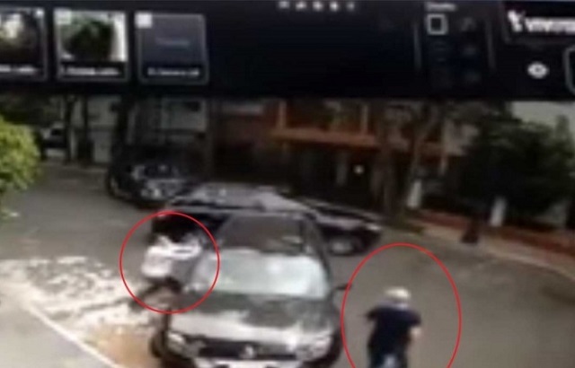En el video se observa a dos sujetos que se acercan caminando a la puerta del copiloto de una camioneta color gris. De manera simultánea un auto color negro sirve como muro ocultando a los dos sujetos.