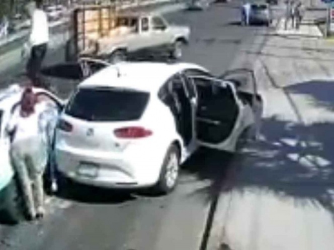 En el material se observa el momento en el que una familia, cuyo automóvil blanco se encuentra mal estacionado sobre el arroyo vehicular, trata de subirse al vehículo con las puertas abiertas del lado del conductor, y de manera intempestiva el taxista que viene a gran velocidad, golpea al auto y atropella a dos de los familiares.