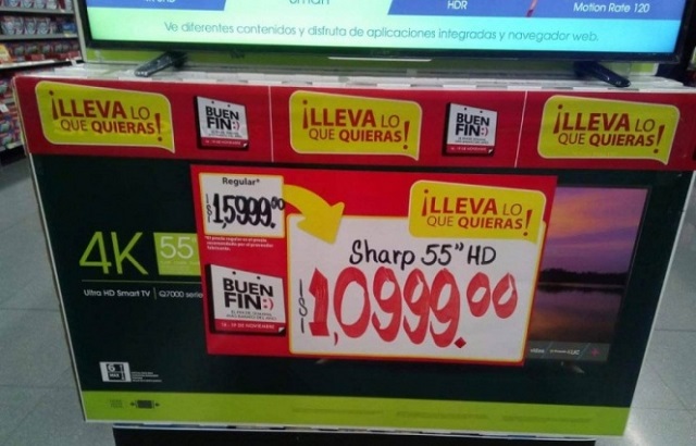 Como parte de la temporada de precios bajos, la tienda hizo los ajustes necesarios en sus carteles; sin embargo, uno de los empleados colocó mal la coma en el precio, provocando que los televisores de 55 pulgadas de la marca Sharp se remataran de 10 mil 990 pesos a mil 099 pesos.