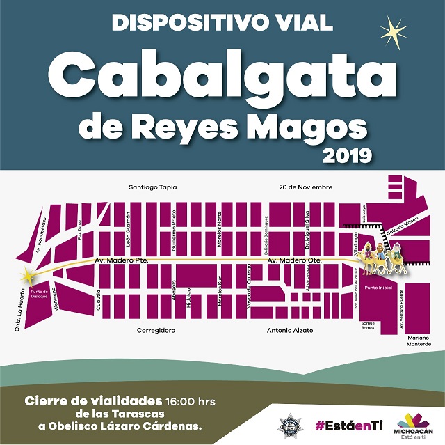 Explicó que la Cabalgata iniciará a las 5 de la tarde de Las Tarascas, y que seguirá por toda la avenida Madero terminando en el Obelisco Lázaro Cárdenas, para lo cual se ha previsto de un dispositivo vial y de seguridad que coordinarán la Secretaría de Seguridad Pública del Estado y la Policía de Morelia.