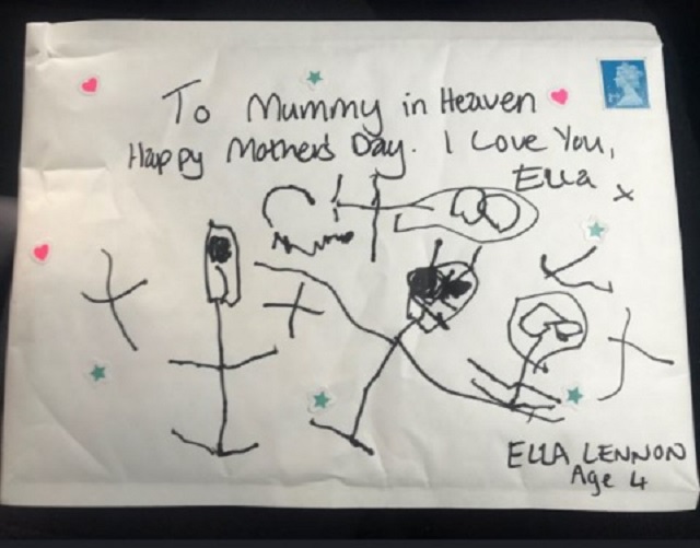 Lennon es una pequeña niña que vive en Kilmarnock, Escocia, y cuya madre murió de cáncer cerebral hace cuatro meses. Para desahogar su tristeza escribió una carta e hizo un dibujo a su ‘mami’ en el cielo diciéndole cuánto la ama y extraña.