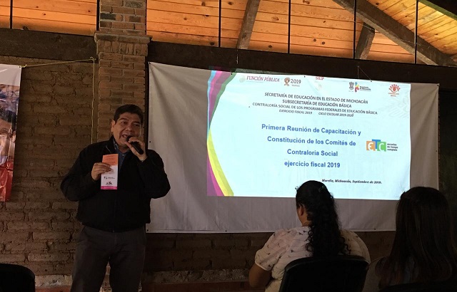 Durante el transcurso de esta semana, se dio inicio a lo dispuesto en el Programa Anual de Trabajo 2019 en dicha materia, con la capacitación a más de 400 padres de familia, directivos y personal del Programa Escuela de Tiempo Completo de los municipios de Hidalgo, Irimbo, Tuxpan, Aporo, Lázaro Cárdenas, Aquila, Arteaga y Uruapan, a quienes se instruyó en difusión, captación de quejas y denuncias, captación de informes de comité y registro de actividades.