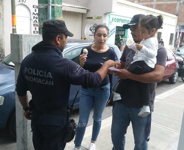 A través de la entrega de material informativo, agentes de la Policía Michoacán realizan diversas labores de proximidad social en diferentes comercios, calles y avenidas de este municipio, enfocadas a evitar ser víctimas de algún hecho ilícito.
