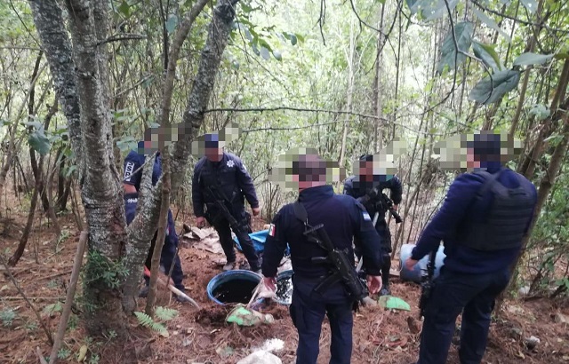 Personal de la Secretaría de Seguridad Pública (SSP), logró el aseguramiento de un laboratorio donde se elaboraba droga sintética, localizándose en el sitio un costal con una sustancia granulada con las características propias de la metanfetamina y bidones que contenías precursores químicos.