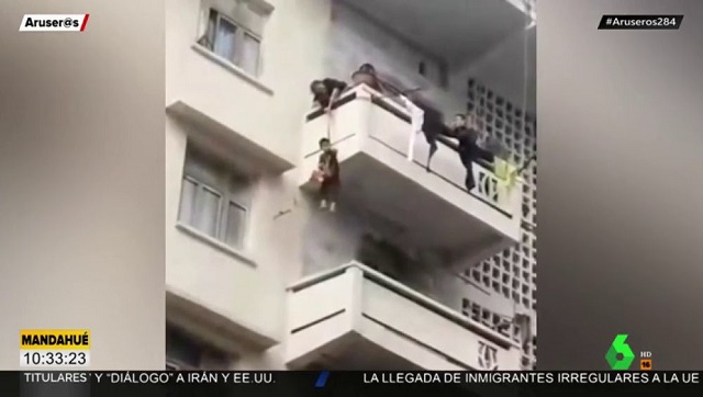 Desde la terraza de un quinto piso, la mujer, con ciertas dificultades, hace descender al pequeño hasta la repisa del segundo piso que es donde se encuentra el animal.