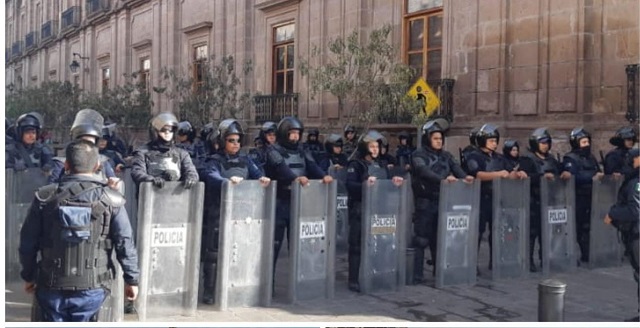 Elementos de la Policía Michoacán, desplegaron un dispositivo de seguridad en las inmediaciones de Palacio de Gobierno, sitio a donde está previsto que arribe el grupo de aproximadamente 200 personas.