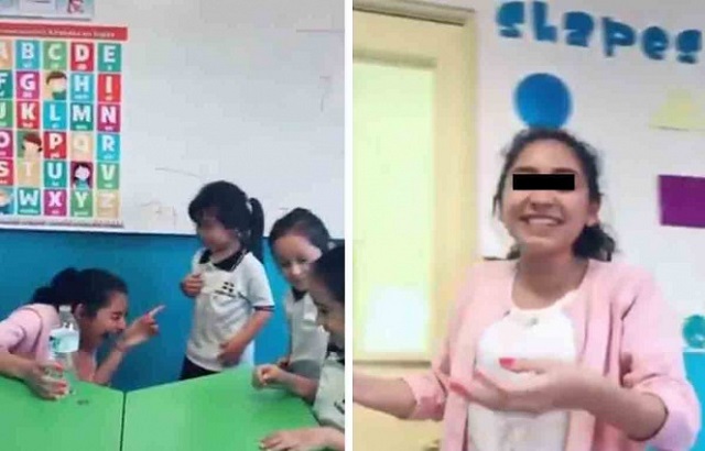 El video muestra a la “Miss” en el salón de clases enseñándoles a los pequeños una botella de agua y una moneda. Después les explica que al colocarla debajo se creará un efecto de magia.