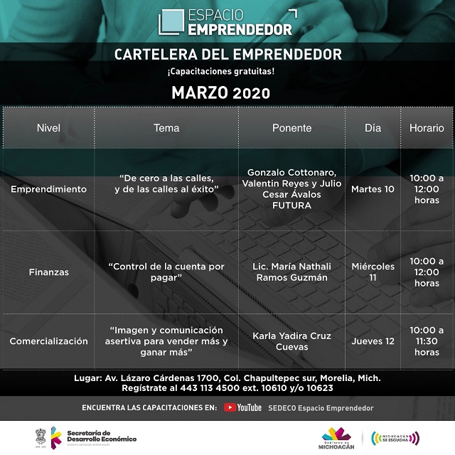En el mes de marzo, la Secretaría de Desarrollo Económico de Michoacán (Sedeco), a través de Espacio Emprendedor, ofrecerá 12 cursos y talleres gratuitos enfocados a temas de finanzas, recursos humanos, emprendimiento, atención al cliente y comercialización.