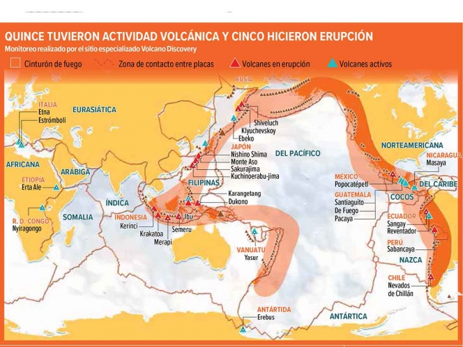 De acuerdo con Volcano Discovery, al menos 25 volcanes presentaron un aumento en su actividad e incluso algunas explosiones, entre ellos el Popocatépetl, en México.