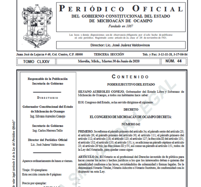 En efecto, en su edición número 44 del Tomo CLXXV, de fecha 30 de junio del 2020, el periódico oficial del gobierno del estado publicó el decreto número 342, que contiene las reformas al párrafo primero del artículo 3o; el párrafo sexto del artículo 23;el artículo 29; el párrafo primero del artículo 30; el artículo 111; el párrafo primero del artículo 112; el artículo 118; el artículo 123; el artículo 127; la fracción III del artículo 131;el artículo 132; el artículo 133; el artículo 151; y, se adiciona un párrafo séptimo al artículo23; el artículo 29 bis; las fracciones III y IV, así como un párrafo al artículo 151, todos dela Ley del Notariado.
