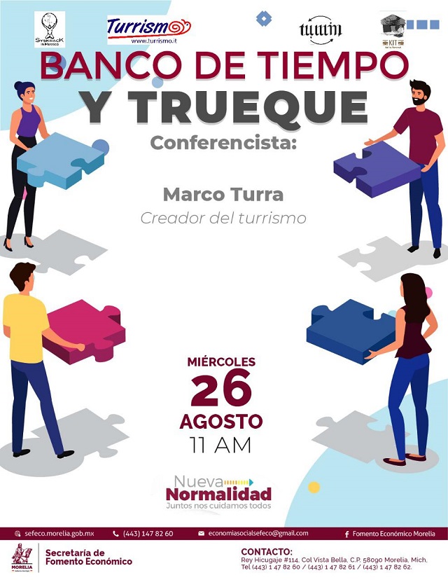 Para dar seguimiento a las acciones que implementa la Dirección de Economía Social y Solidaria municipal, mismas que ha instruido el Presidente Municipal, Raúl Morón Orozco, se realizará la capacitación “Banco de Tiempo y trueque”, el próximo miércoles 26 de agosto, a las 11:00 horas, misma que será impartida por Marco Turra.