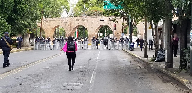 A fin de evitar incidentes, la Secretaría de Seguridad Pública (SSP), mantiene un dispositivo de vigilancia en la calzada Ventura Puente, por una manifestación que se lleva a cabo en las inmediaciones de la Secretaría de Finanzas y Administración (SFA).