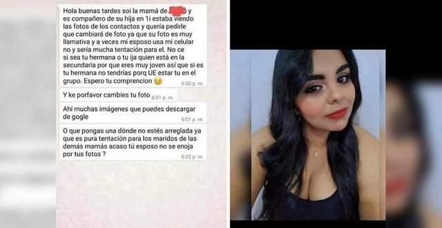 “Hola, buenas tardes. Soy la mamá de … y es compañero de su hija en primero. Estaba viendo las fotos de los contactos y quería pedirle que cambiara de foto ya que su foto es muy llamativa y a veces mi esposo usa mi celular y sería mucha tentación para él. No sé si sea tu hermana o tu hija quien está en la secundaria porque eres muy joven, así que si es tu hermana no tendrías que estar tú en el grupo. Espero tu comprensión”