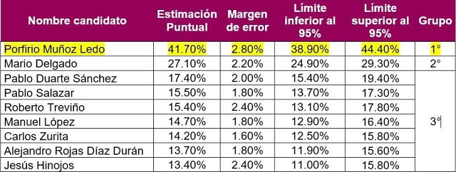 Este miércoles se dio a conocer el resultado de la encuesta de conocimiento, fase previa a la encuesta electiva y DON PORFIRIO MUÑOZ LEDO obtuvo el primer lugar con el 41.70% de los encuestados, logrando casi, el 2-1 a su más cercano perseguidor, el diputado federal MARIO DELGADO CARRILLO quien obtuvo el 27.10%.