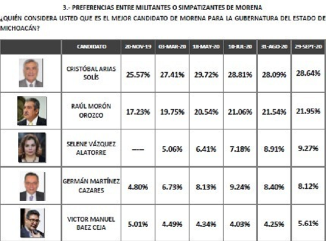 Y las podemos observar, el que encabeza las preferencias electorales en esta mediciones, es el senador CRISTÓBAL ARIAS SOLÍS, con el 28.64%, es decir, 3.97 puntos porcentuales menos que MORENA, de manera que ARIAS SOLÍS no le aporta nada de preferencia electoral al partido y también nos lleva a concluir que su tope de crecimiento no es mayor a 29 puntos porcentuales, preferencia menor que la del partido.
