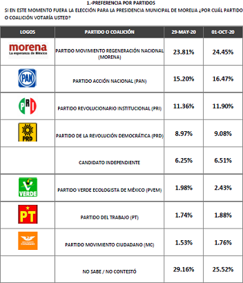 Sin embargo, la medición demoscópica también revela que los partidos opositores, de competir de manera individual, sería casi imposible que pudieran superar los casi 10 puntos porcentuales que MORENA le saca de ventaja y de concertarse la alianza PAN-PRD, apenas serían competitivos, por lo que es concluirse, que la única manera de derrotar al partido en el gobierno es construyendo una alianza tripartidaria.